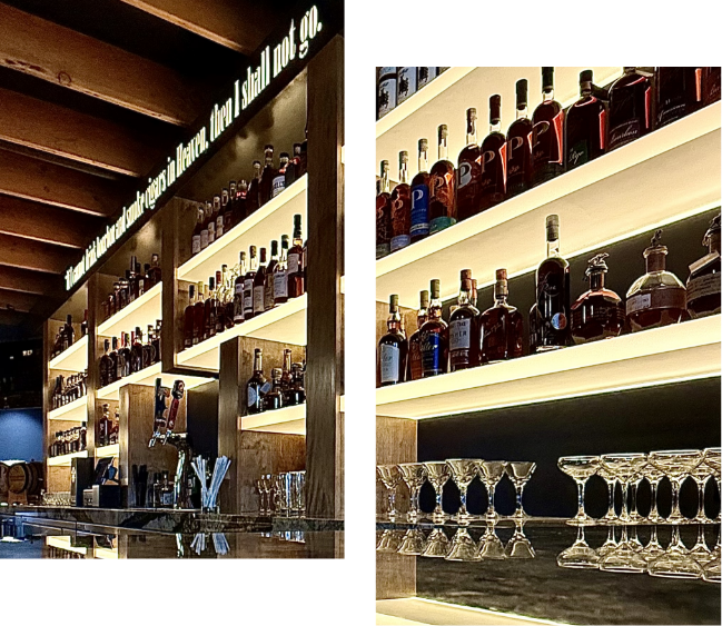 Our carefully curated selection features rare bourbon finds, local favorites, timeless classics, and an elevated full-bar program showcasing expertly crafted cocktails. Guests can also explore a modern wine experience by the glass, along with access to our full retail bottle shop featuring premium bourbons and select wines to enjoy at home.